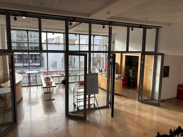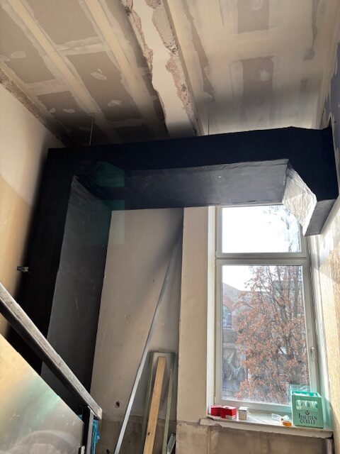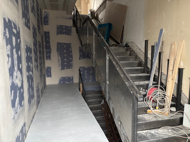 Doch es geht weiter voran – und das ist entscheidend! Die neue Stahltreppe ist eingebaut, und im neuen Treppenhaus entstehen derzeit die letzten Brandwände im Trockenbau. Auch die Glasabtrennung zum Foyer ist bereits fertiggestellt.