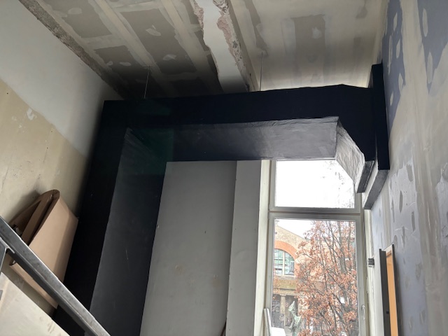 Im 1. Obergeschoss haben die Arbeiten an der neuen Foyerabtrennung begonnen: Die Decke wurde geöffnet, um den brandschutzgerechten Anschluss der kommenden Glasabtrennung vorzubereiten.