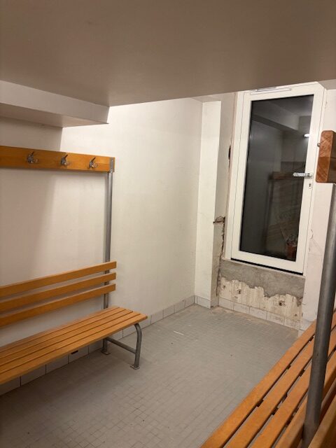Um die Turnhalle und den Jugend- und Bandraum im Untergeschoss mit einem zweiten Rettungsweg auszustatten, der im Notfall auch von kleineren Kindern und Rettungskräften mit Rettungsgerät genutzt werden kann, wird der an die Herrenumkleide angrenzende Lichtschacht vergrößert und mit einer Fluchttreppe versehen. Diese ist im Normalfall mit einem begehbaren Lichtschachtgitter verschlossen.